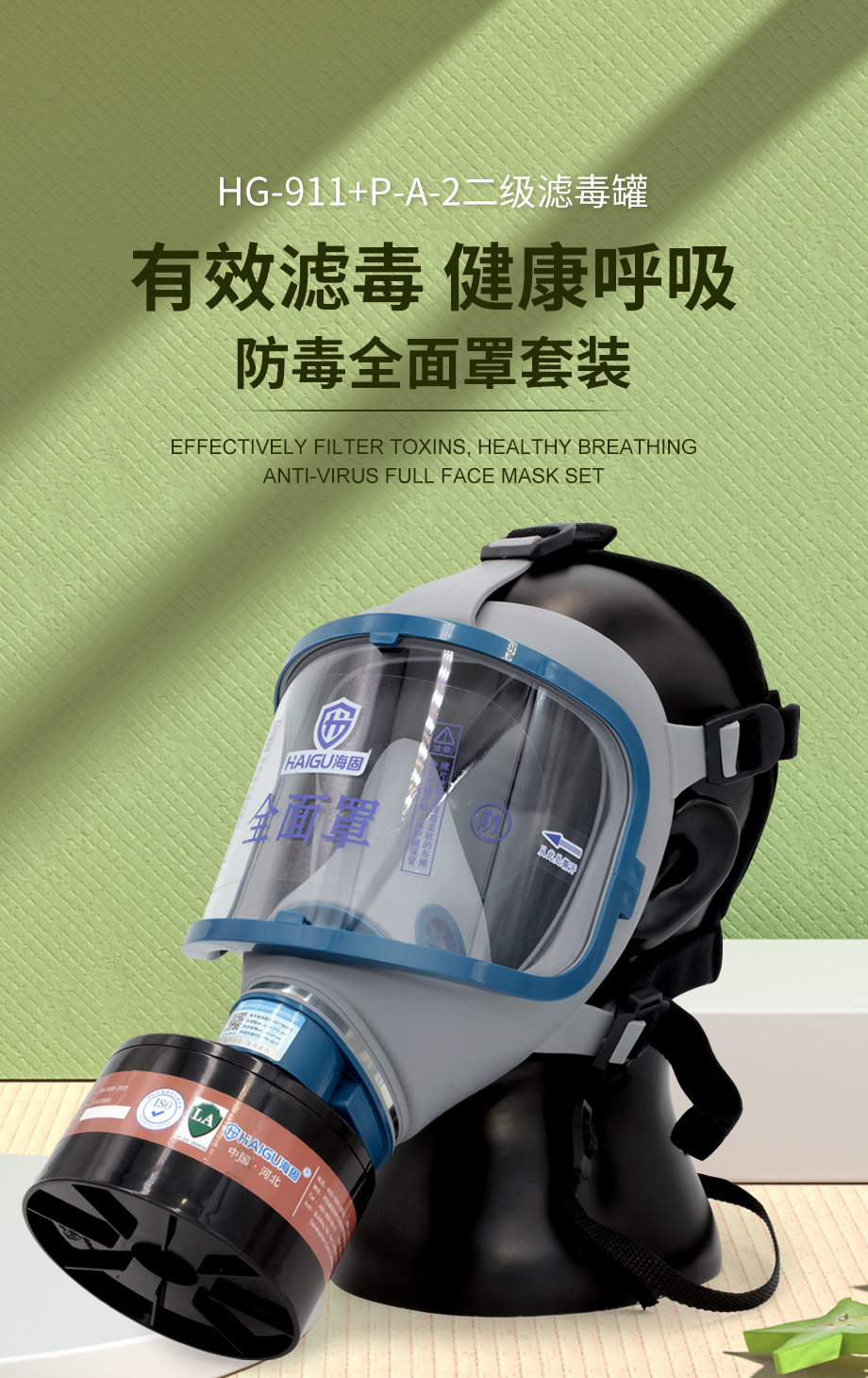 海固911全面罩+P-A-2滤毒罐 活性炭防毒面具 甲醛 醇类