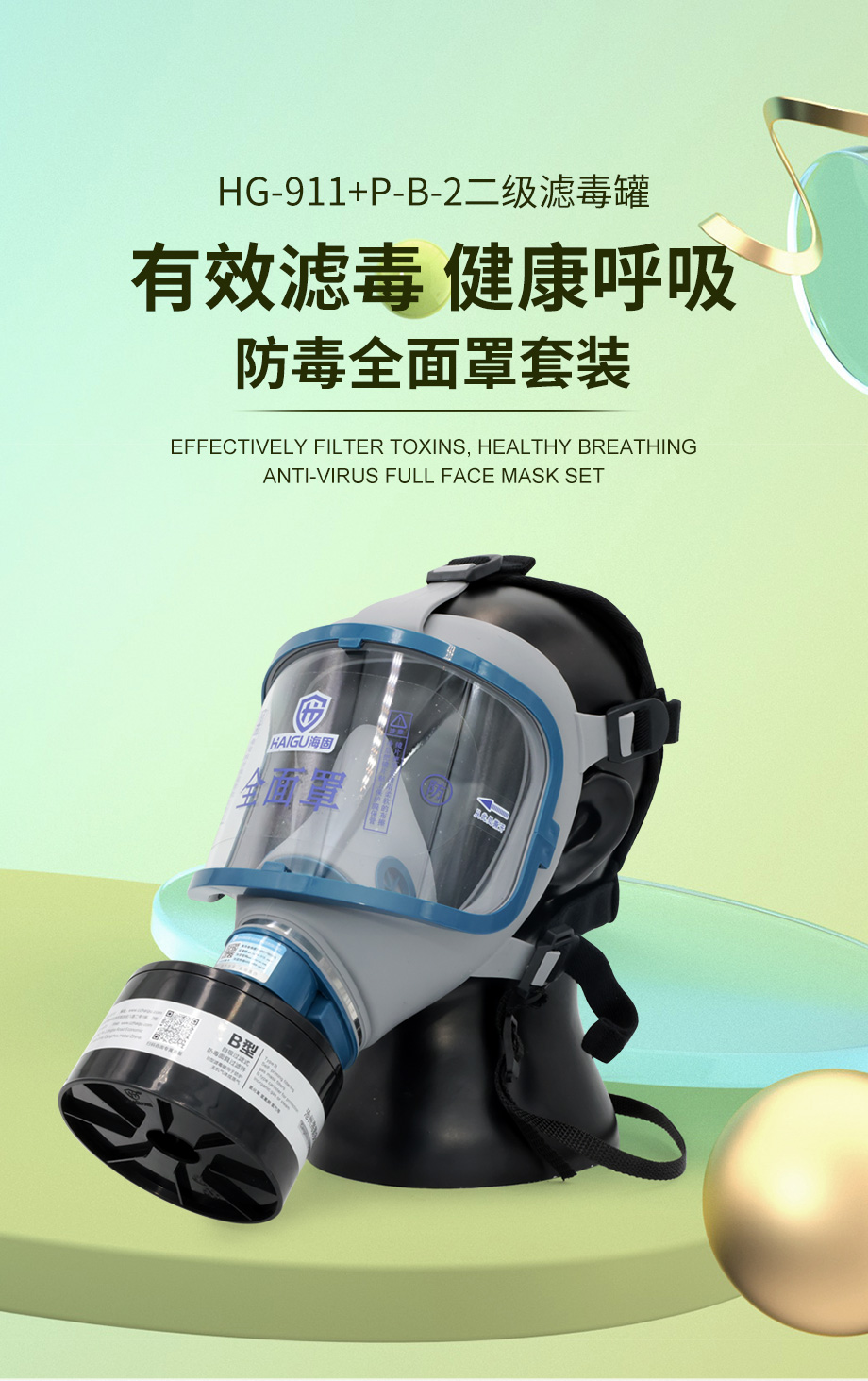 海固911全面罩+P-B-2滤毒罐 防毒面具 无机气